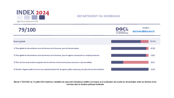 L’index de l'égalité professionnelle est calculé sur une base de cent points répartis sur quatre indicateurs, assortis d'une pondération et d'un barème. Il est destiné à mesurer l'écart global de rémunération entre les femmes et les hommes pour les fonctionnaires et pour les contractuels, mais également l'écart de taux de promotion de grade entre les femmes et les hommes, ainsi que le nombre d'agents publics du sexe sous-représenté parmi les dix agents publics ayant perçu les plus hautes rémunérations.