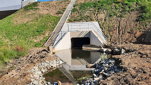 Comparable à un petit aqueduc, cet aménagement permet de recréer le lit naturel du ruisseau. Les pentes du cours d’eau ont aussi été retravaillées pour faciliter le retour des espèces vers l’amont.