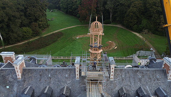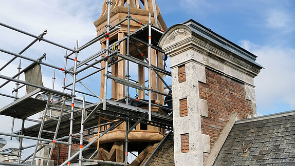 Dans la charpente du corps central, on pouvait encore apercevoir les vestiges de l’ancien campanile (petit clocher). Grâce aux archives et éléments conservés, le campanile a pu être reconstruit à l’identique du modèle existant au XIXe siècle, disparu depuis des décennies. La charpente du campanile est recouverte de zinc, de même que son dôme orné d’écailles de zinc. L’horloge a également été restaurée et sera réinstallée. L’ancienne cloche ayant disparu, une nouvelle sera fondue