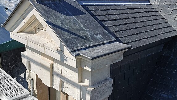 Les lucarnes en pierre, ajoutées au XIXe siècle, étaient maintenues par des tirants métalliques (tiges de renfort) en mauvais état, souvent décrochés ou rouillés. Lors des travaux menés sur la couverture, il s’est avéré que les lucarnes contenaient du fer oxydé, ce qui avait causé l’éclatement de plusieurs pierres. Elles ont donc été nettoyées, puis pour la plupart démontées et remplacées. Les anciens tirants ont été remplacés par des pièces en métal inoxydable. Les acrotères sculptés (éléments décoratifs en pierre sur les frontons) avaient disparu, mais un exemplaire retrouvé dans les combles a servi de modèle, et ils ont pu être recréés en pierre calcaire. Les frontons ont tous été protégés par une couverture en plomb.