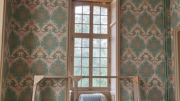 Toutes les menuiseries ont été déposées et restaurées avec soin en atelier. De retour au château, après sondage des couches de peinture, elles ont été repeintes à l’extérieur avec un blanc légèrement teinté, proche de celui utilisé au XIXe siècle. Les couleurs intérieures ont quant à elles été restituées pour les pièces pourvues de décors.