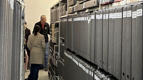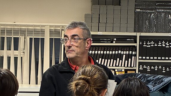 Dans un second temps, ils ont bénéficié d’une visite guidée des coulisses des archives départementales, intégralement menée en breton par André Le Meut, chargé des archives manuscrites, imprimées et sonores en breton, soñour ha kañour brudet e bro Gwened (sonneur et chanteur bien connu en pays vannetais).